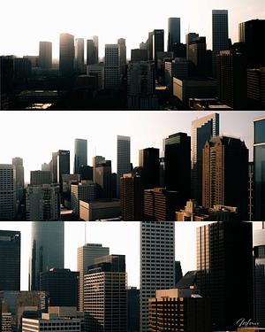 A view from a rooftop in downtown houston during Golden Hour